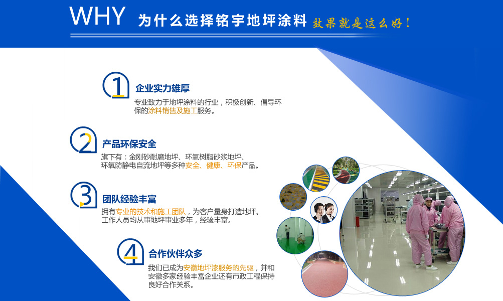 安徽銘宇建材科技有限公司是一家致力于地坪涂料的行業(yè),旗下有金剛砂耐磨地坪,環(huán)氧樹脂砂漿地坪,環(huán)氧防靜電自流地坪,停車場(chǎng)防滑地坪,混凝土密封固化劑和丙烯酸球場(chǎng),無(wú)震動(dòng)止滑車道、塑膠跑道、工廠地板漆等工程施工服務(wù)。 憑借本身的技術(shù)能力和研發(fā)條件,加上多年對(duì)環(huán)氧地坪和耐磨硬化地坪等各類工業(yè)地坪的涂裝、施工的實(shí)踐經(jīng)驗(yàn)、技術(shù)己處于國(guó)內(nèi)專業(yè)水平,經(jīng)檢測(cè)機(jī)構(gòu)檢驗(yàn)符合相應(yīng)的技術(shù)標(biāo)準(zhǔn)。同時(shí)安徽銘宇建材科技有限公司還組建了經(jīng)驗(yàn)豐富的工程技術(shù)隊(duì)伍以及工程施工隊(duì)伍、簡(jiǎn)歷了完善的售后施工服務(wù)體系,滿足用戶的需要。 安徽銘宇建材科技有限公司是一家積極創(chuàng)新、倡導(dǎo)環(huán)保的涂料銷售及施工服務(wù)的廠家,安徽銘宇建材科技有限...